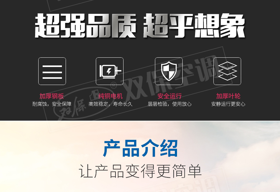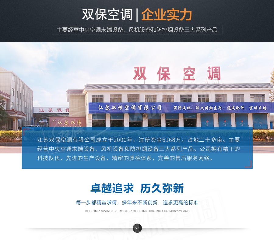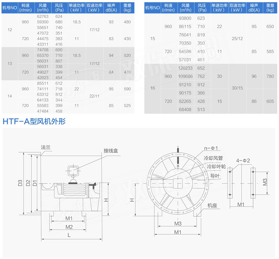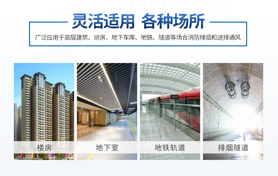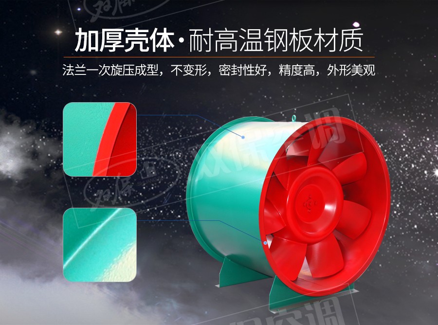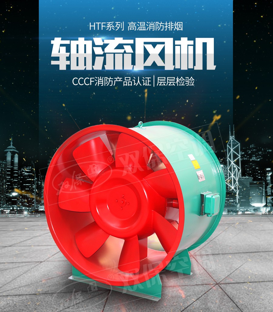 江蘇雙保空調有限公司—HTF系列風機設計獨特,高溫電機全封閉內置,配設專門的電機冷卻系統,采用CAD軟件多目標優化設計的軸流和混流葉輪結構,通過多選驅動形式,達到一機兩用(即常用送排通風和消防使用時高溫排煙),配設電控箱后可遠程自動控制。具有耐高溫性能優良、效率高、體積小,安裝簡便(水平、垂直、吊裝均可)等優點,廣泛應用于高層建筑、烘房、地下車庫、地鐵、隧道等場合消防排煙和送排通風。按GA211-1999按《消防排煙風機耐高溫試驗方法》測定,能在280℃高溫條件下連續運行40分鐘以上,已被全國各大城市消防部門認可采用。