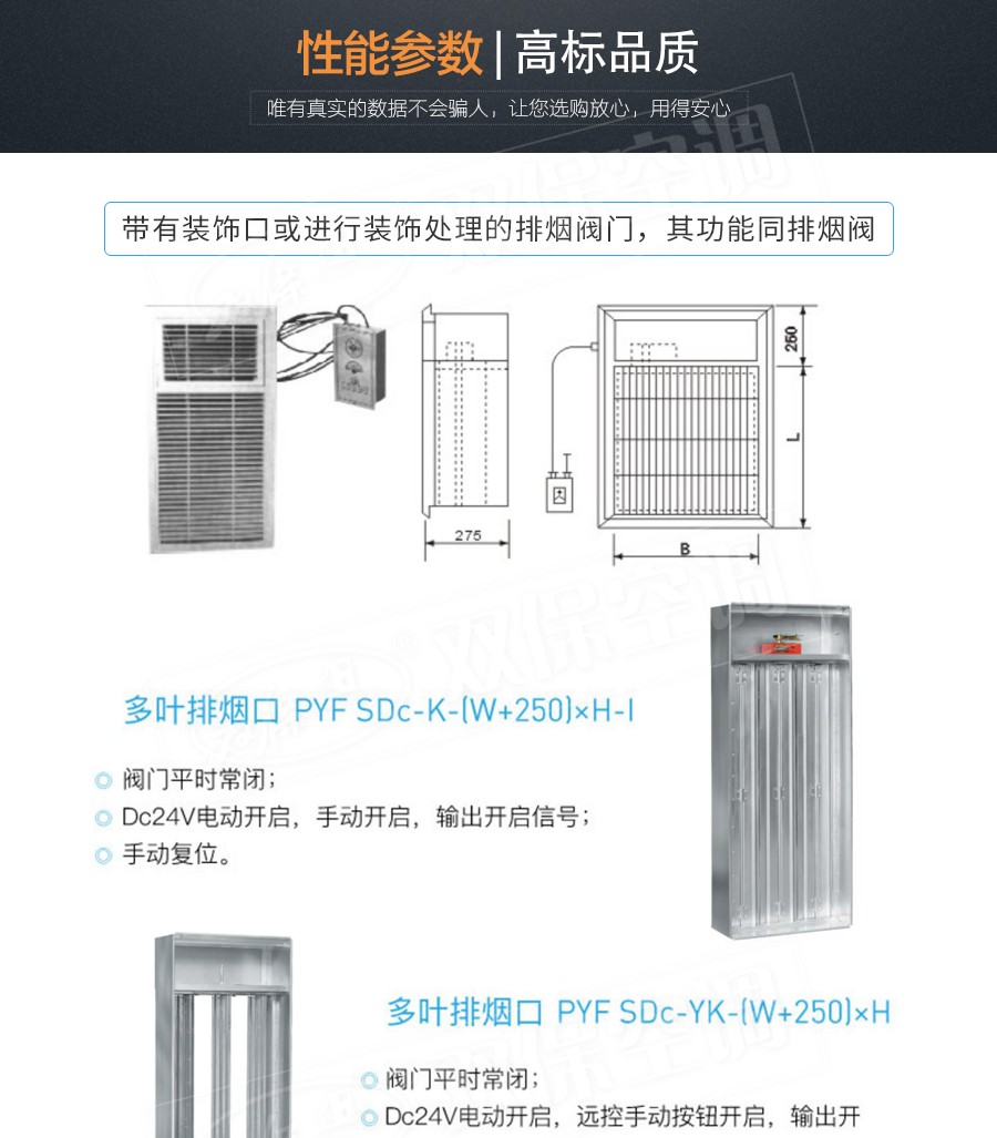 江蘇雙保空調有限公司—遠控多葉排煙口 閥門平時常閉; Dc24V電動開啟,遠控手動按鈕開啟,輸出開信號; 遠控手動復位。