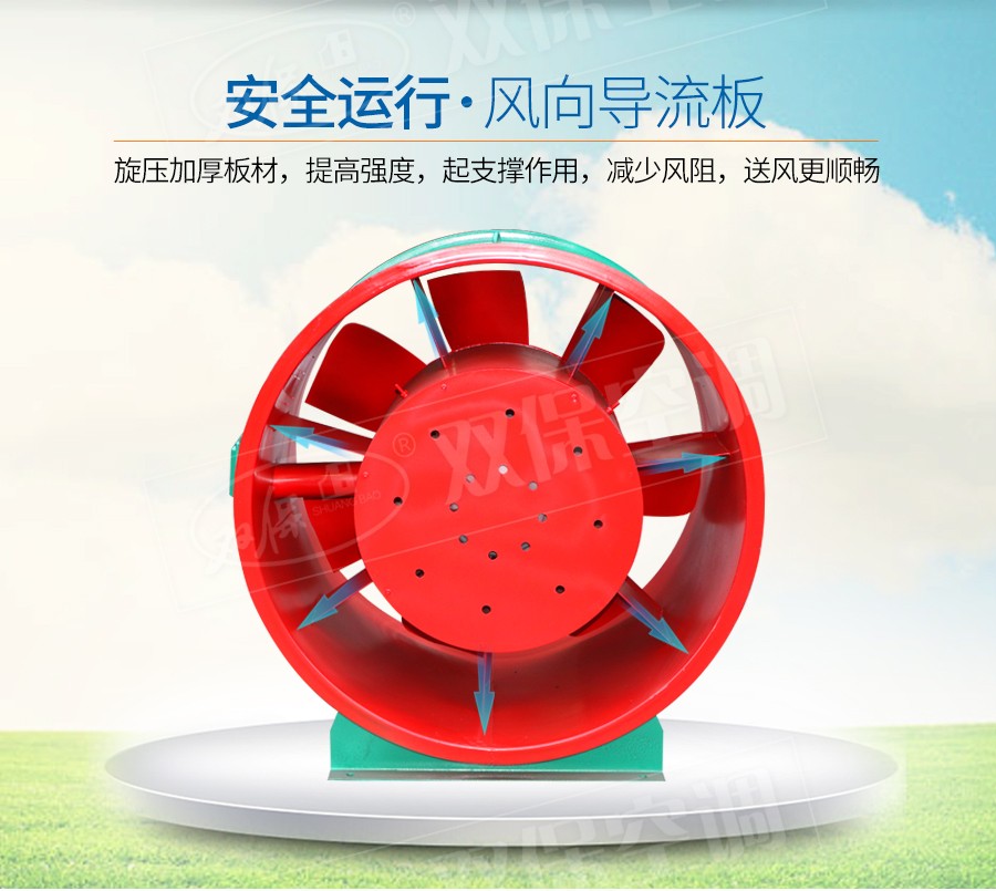 江蘇雙保空調有限公司—HTF系列風機設計獨特,高溫電機全封閉內置,配設專門的電機冷卻系統,采用CAD軟件多目標優化設計的軸流和混流葉輪結構,通過多選驅動形式,達到一機兩用(即常用送排通風和消防使用時高溫排煙),配設電控箱后可遠程自動控制。具有耐高溫性能優良、效率高、體積小,安裝簡便(水平、垂直、吊裝均可)等優點,廣泛應用于高層建筑、烘房、地下車庫、地鐵、隧道等場合消防排煙和送排通風。按GA211-1999按《消防排煙風機耐高溫試驗方法》測定,能在280℃高溫條件下連續運行40分鐘以上,已被全國各大城市消防部門認可采用。