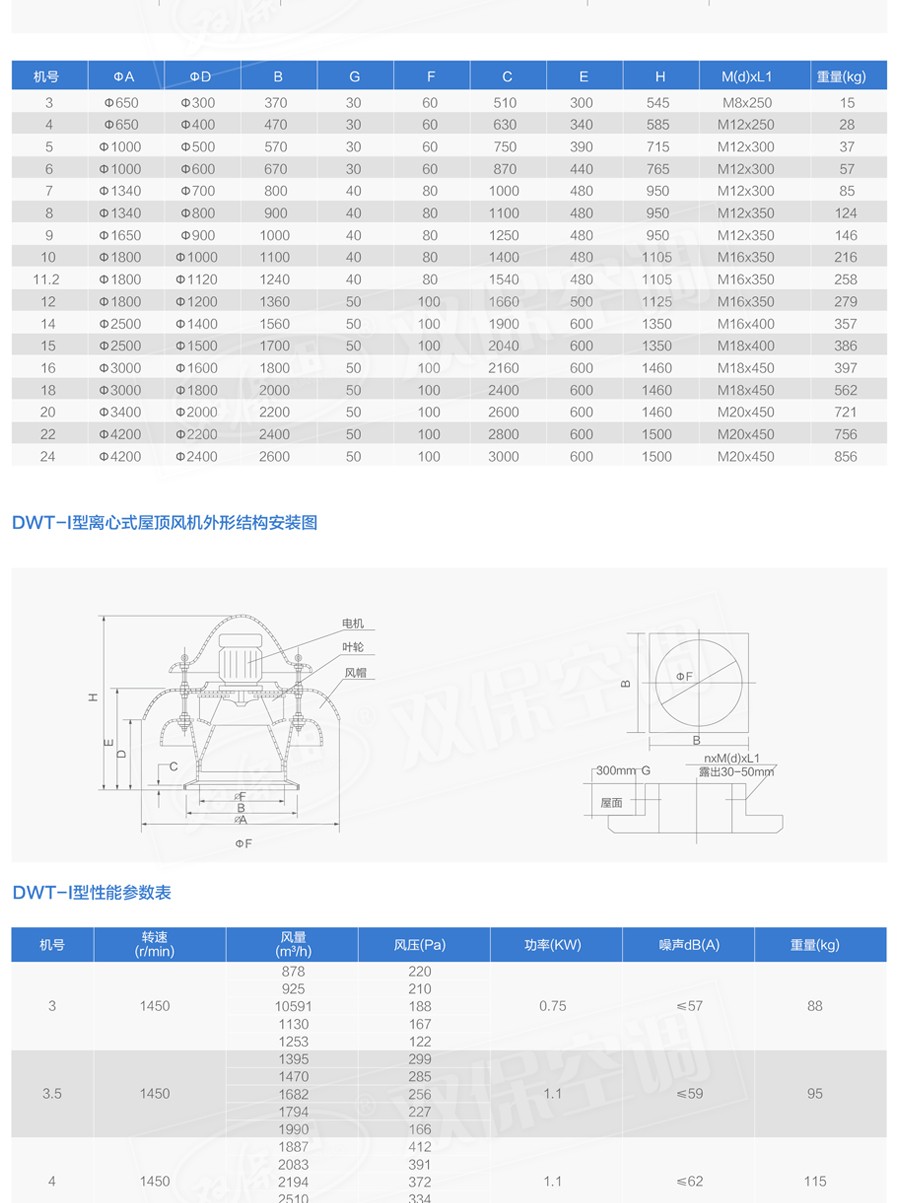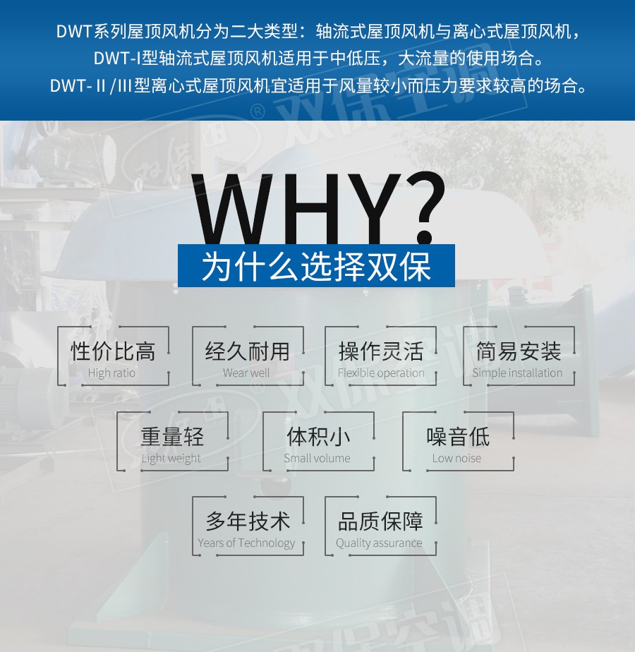 江蘇雙保空調有限公司—DWT系列屋頂風機分為二大類型。其一,軸流式屋頂風機:型號為DWT-I型適用于中低壓,大流量的使用場合。其二,離心式屋頂風機:型號為DWT-Ⅱ型、DWT-Ⅲ型二種型式,宜適用于風量較小而壓力要求較高的場合。