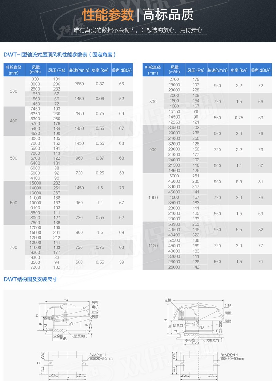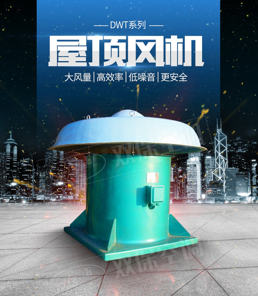 【風機特點】DWT系列屋頂風機分為二大類型。其一,軸流式屋頂風機:型號為DWT-I型適用于中低壓,大流量的使用場合。其二,離心式屋頂風機:型號為DWT-Ⅱ型、DWT-Ⅲ型二種型式,宜適用于風量較小而壓力要求較高的場合。