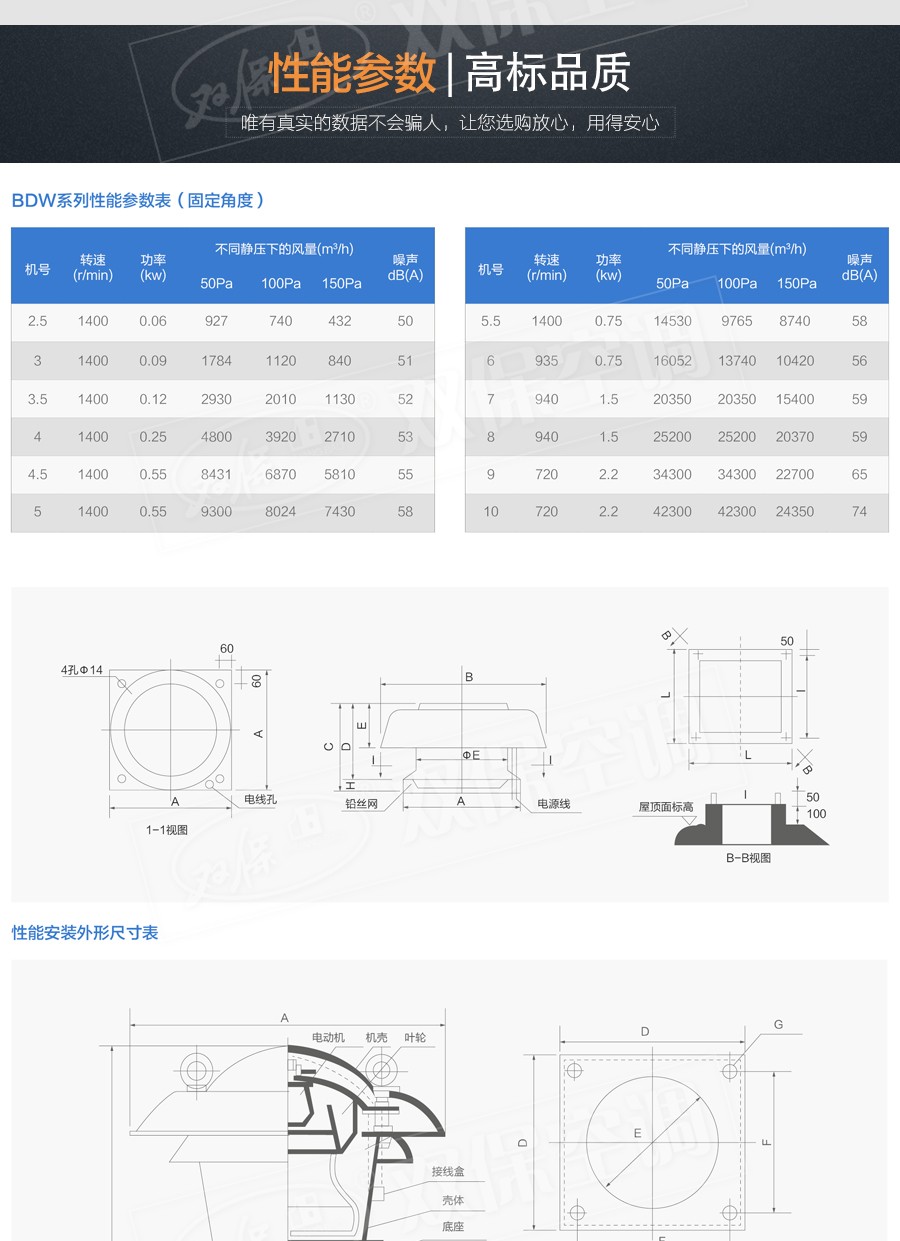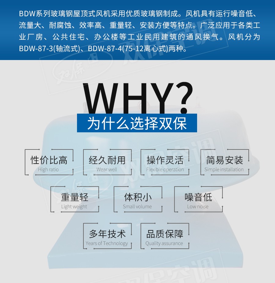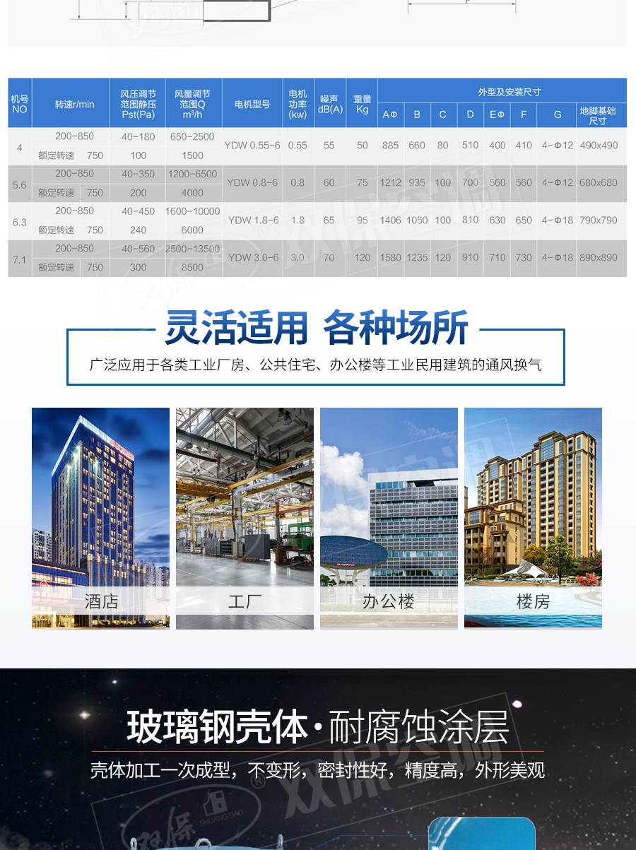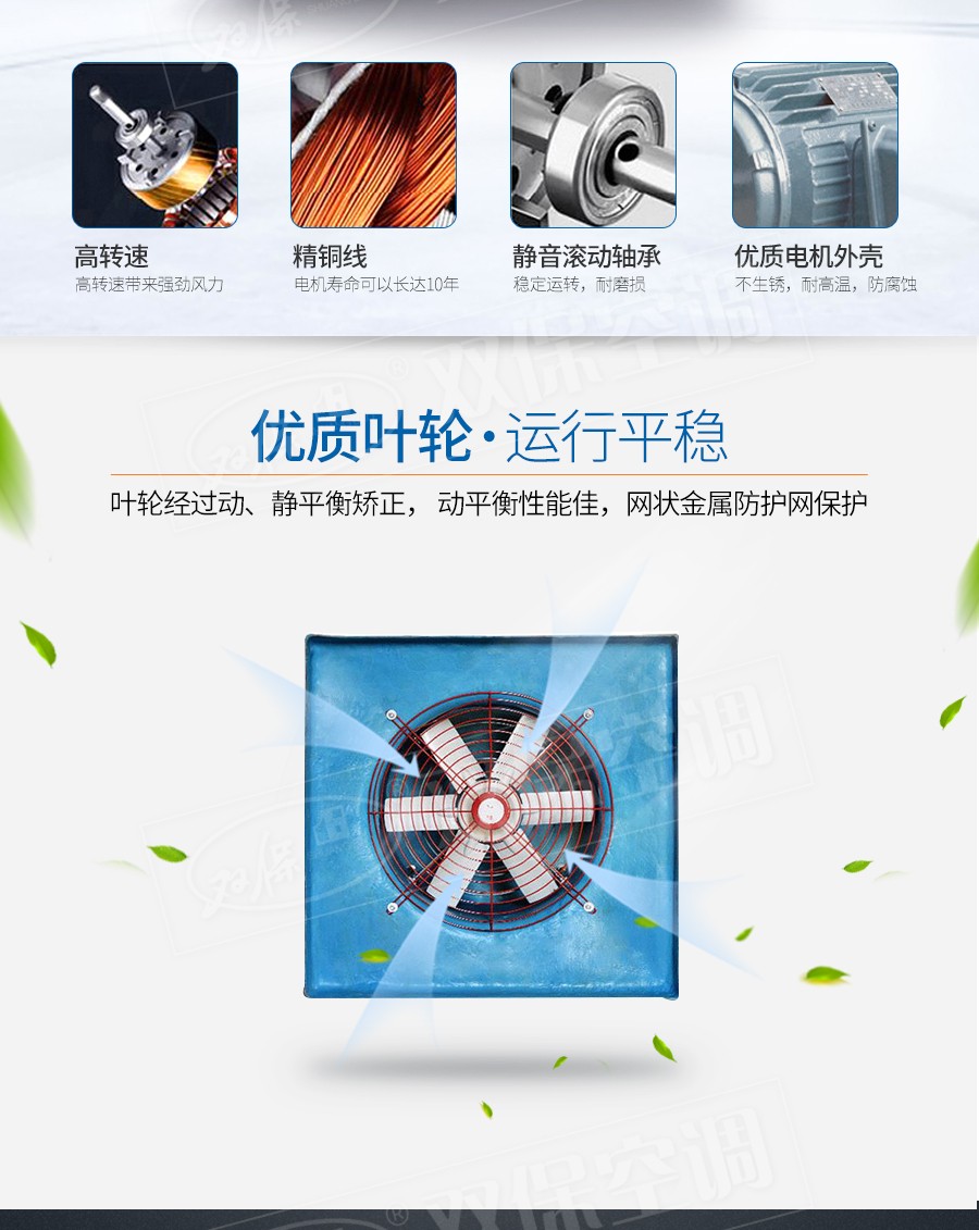 【風機特點】運行噪音低、流量大、耐腐蝕、效率高、重量輕、安裝方便等特點。