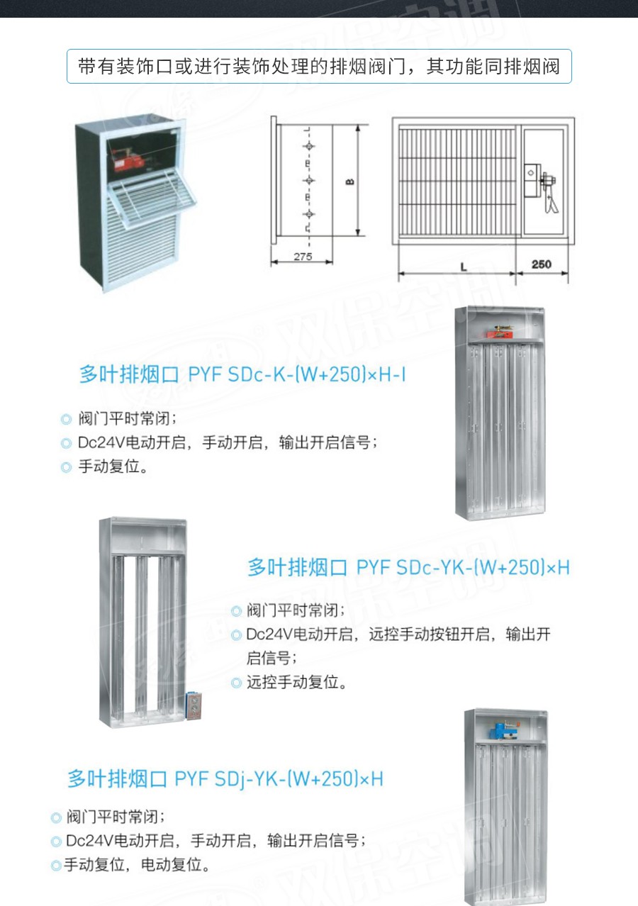 江蘇雙保空調(diào)有限公司—多葉排煙口 閥門平時(shí)常閉; Dc24V電動(dòng)開(kāi)啟,手動(dòng)開(kāi)啟,輸出開(kāi)啟信號(hào); 手動(dòng)復(fù)位。
