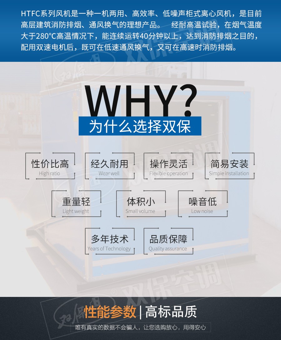 江蘇雙保空調有限公司—HTFC系列風機是我公司研制成功的一種一機兩用、高效率、低噪聲柜式離心風機,具有明顯的噪聲低、耐高溫性能優(yōu)良、結構新穎緊湊、振動小、重量輕、安裝維護方便等優(yōu)點,廣泛應用于賓館、飯店、禮堂、影劇院、地下室、廠礦企業(yè)、辦公樓等需要消防排煙、廚房排油煙及通風換氣的場合(吊裝、坐地安裝均可),既可送風又可排風,現(xiàn)已暢銷全國各地,深受用戶好評,是目前高層建筑消防排煙、通風換氣的理想產(chǎn)品。 本系列產(chǎn)品分為A型和B型兩種,電動機安裝在箱體外的為A型,經(jīng)耐高溫試驗,在煙氣溫度大于280℃高溫情況下,能連續(xù)運轉40分鐘以上,達到消防排煙之目的,配用雙速電機后,既可在低速通風換氣,又可在高速時消防排煙,為一機兩用:電動機安裝在箱體內(nèi)的為B型,一般作送排通風使用。