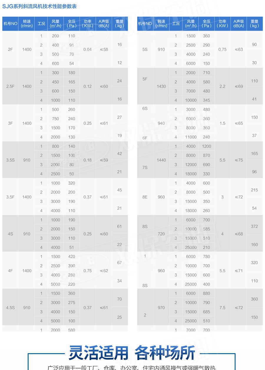 江蘇雙保空調有限公司—SJG系列斜流風機是SWF系列混流風機的派生型產品,兩者的基本原理特點相似。不同之處在于斜流風機采用鼓型風筒,從而改變葉輪形狀達到斜流。而混流風機是在保持風筒不變徑的前提下,內置集流器,通過葉輪的優化扭曲(亦叫斜流子午加速方法)特殊設計制作,同型號斜流風機的風壓較混流風機高,該風機最適用于直管道加壓送風和排風。占地少、安裝方便(水平、垂直、吊裝均可)。