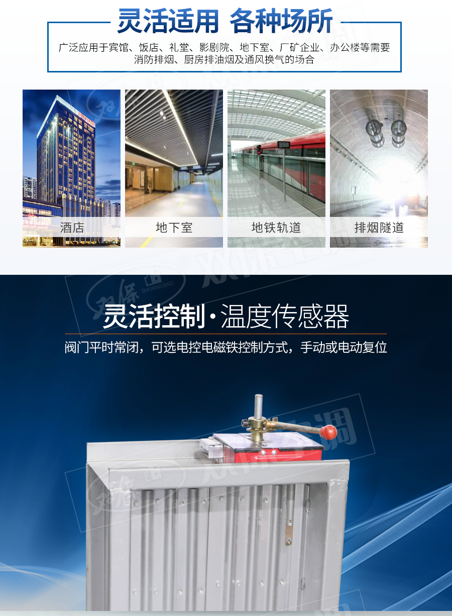 【閥門特點】CCCF認證,輕巧實用,安全可靠,壽命長久。一般應用于火災排煙管穿越防火墻處,煙氣溫度超過280度時自動熔斷關閉,可聯動關閉排煙風機。